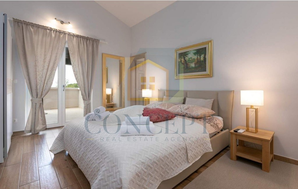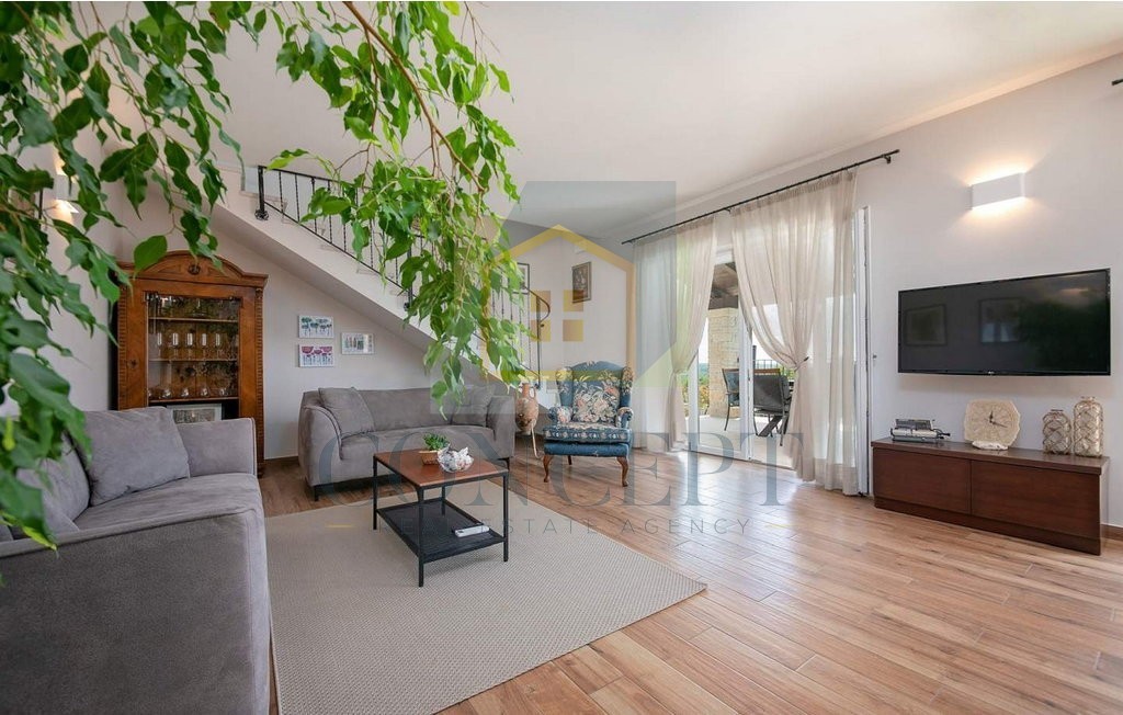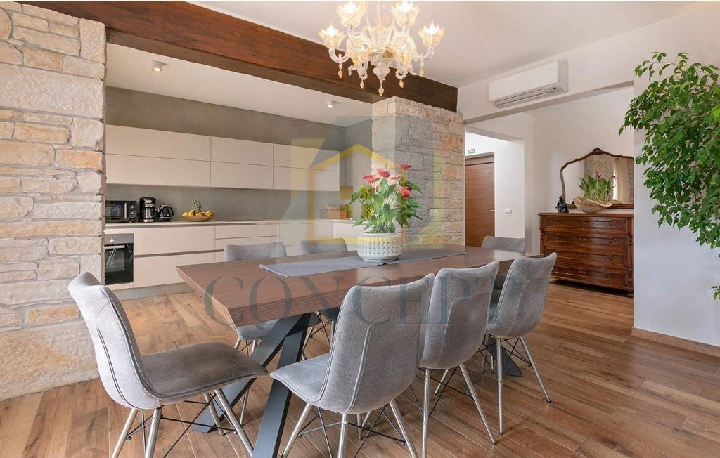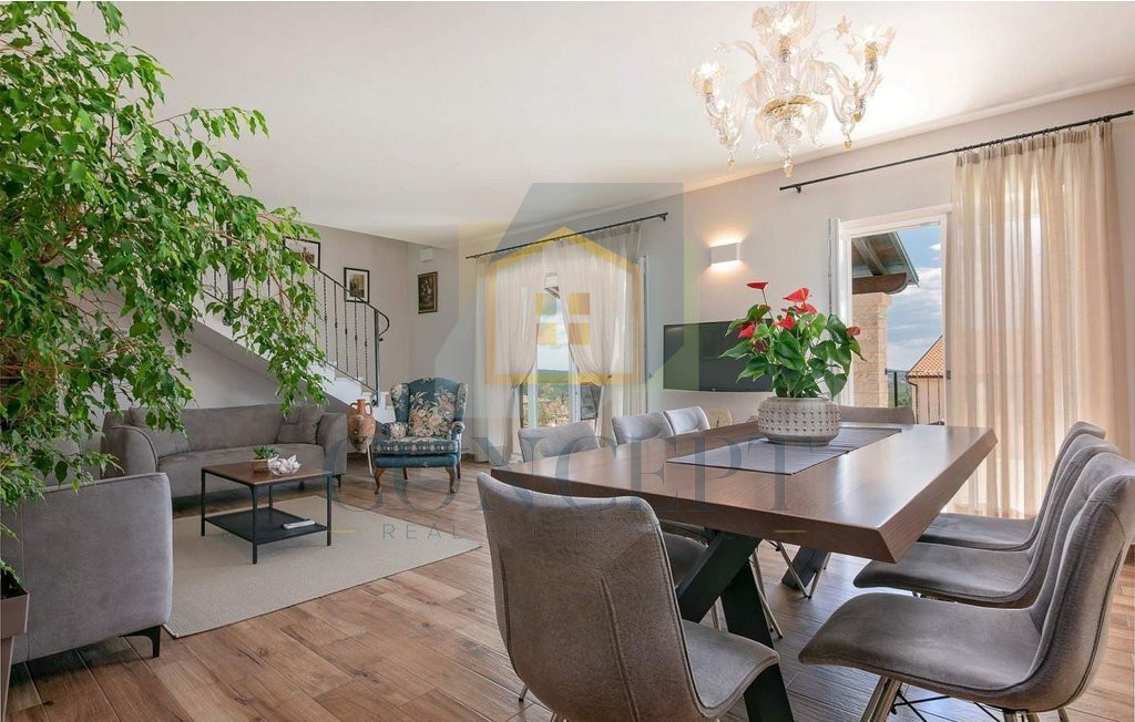 In der Umgebung von Poreč, in ruhiger und erhöhter Lage, wird eine Villa verkauft, die mit einer Kombination aus klassischen und modernen Details gestaltet ist und einen Panoramablick auf die Natur und das Meer bietet. Die Villa befindet sich auf einem komplett eingezäunten Grundstück von 562 m², die gesamte Wohnfläche beträgt 355 m² und ist auf drei Etagen verteilt. Sie wurde im Jahr 2018 erbaut.