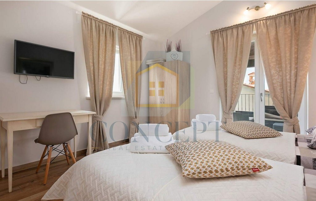 Sie befindet sich in einem Wohngebiet, das alle notwendigen Einrichtungen für das Wohnen oder die touristische Vermietung bietet – Geschäfte, Schule, Kindergarten, Restaurants und andere Dienstleistungen. Die Stadt Poreč ist 15 km und Rovinj 20 km entfernt.