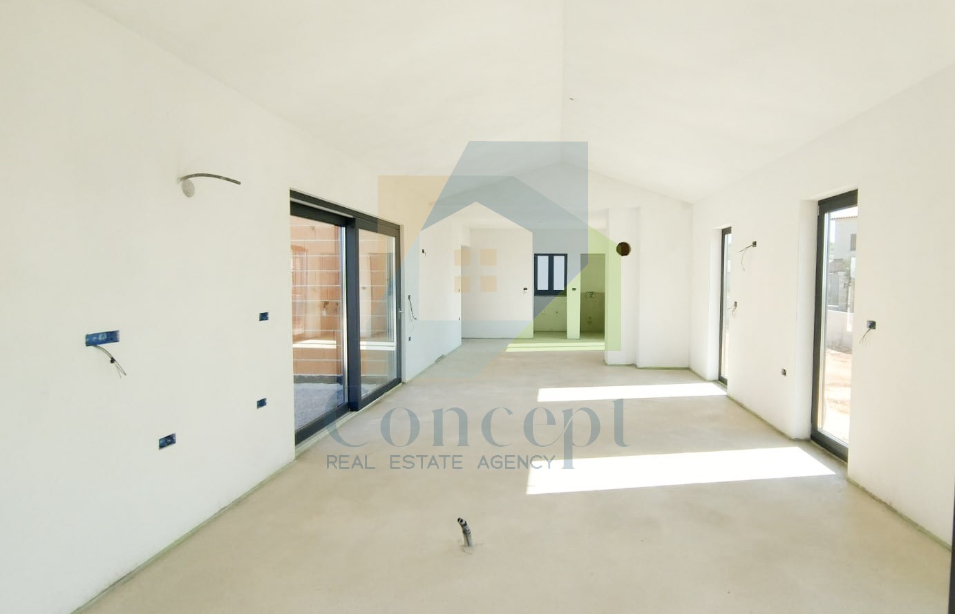 Die Villa erstreckt sich über ein Grundstück von 750 m², während die Wohnfläche 159,52 m² beträgt. Im Erdgeschoss befinden sich funktionale Räume, darunter ein Flur, ein geräumiges Wohnzimmer, das mit der Küche und dem Essbereich verbunden ist, sowie ein Schlafzimmer mit eigenem Badezimmer. Außerdem gibt es ein Gäste-WC, einen Abstellraum (Technikraum) und eine überdachte Terrasse, die zusätzlichen Platz zum Entspannen und Verweilen bietet.