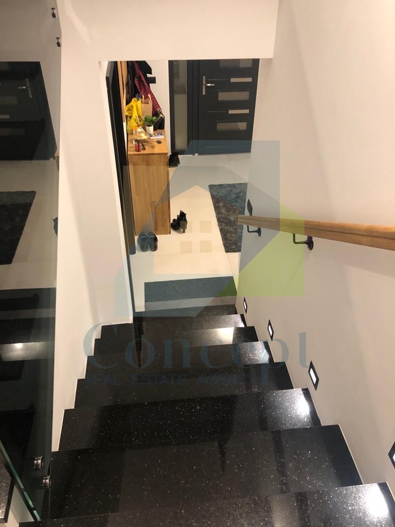 The total living area of the house is 158 m², situated on a plot of land measuring 550 m². On the ground floor, there is an entrance hallway, a fully equipped kitchen, a dining area, a living room with a fireplace, and a storage room. Additionally, on the ground floor, there is a bedroom with an en-suite bathroom and a wardrobe, and the living room has access to a terrace and a landscaped yard.