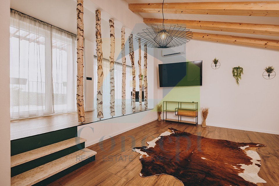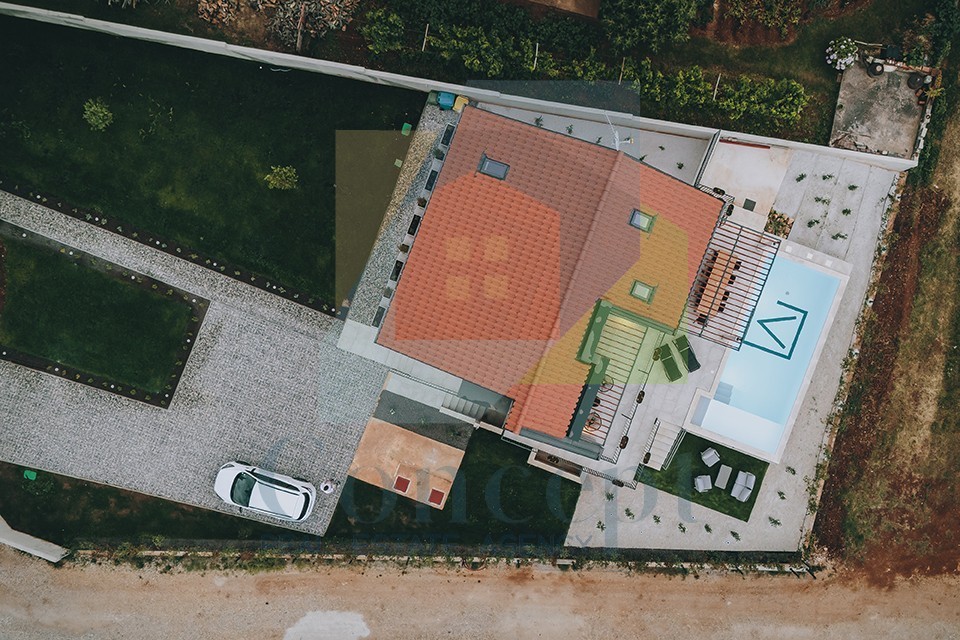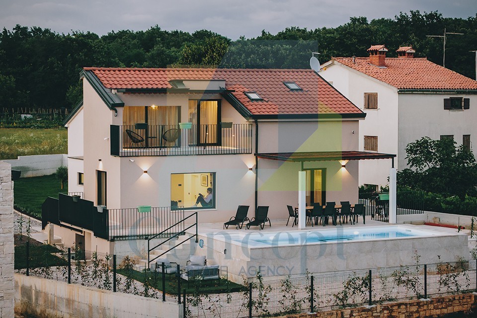 In a peaceful location, on the edge of the construction zone and just 17 km from Poreč and the sea, there is a uniquely designed house with a swimming pool.