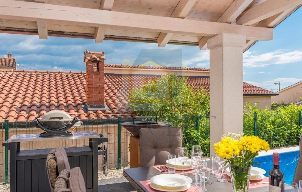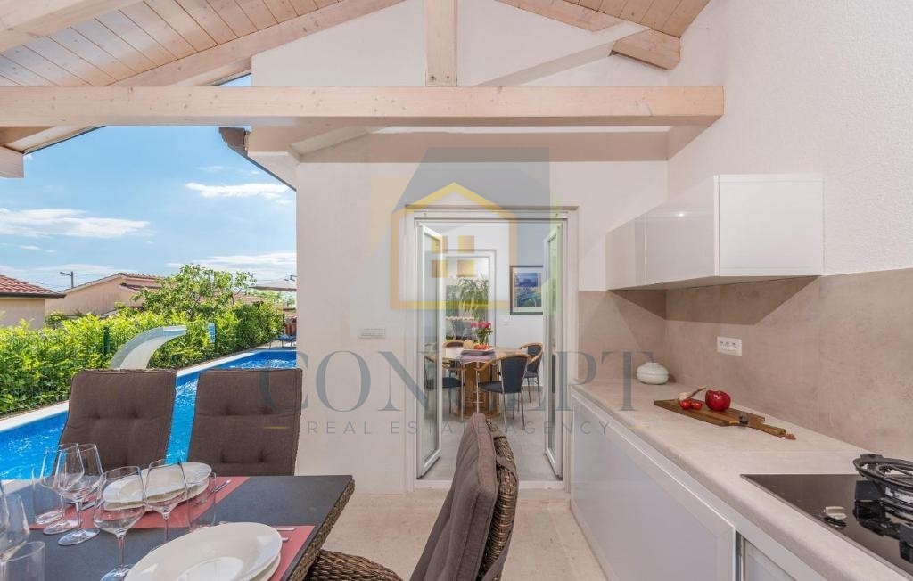 U vanjskom dijelu nekretnine nalazi se grijani bazen sa slanom vodom površine 28 m² , sunčalište te natkrivena ljetna kuhinja s roštiljem – idealna za boravak i pripremu obroka na otvorenom.