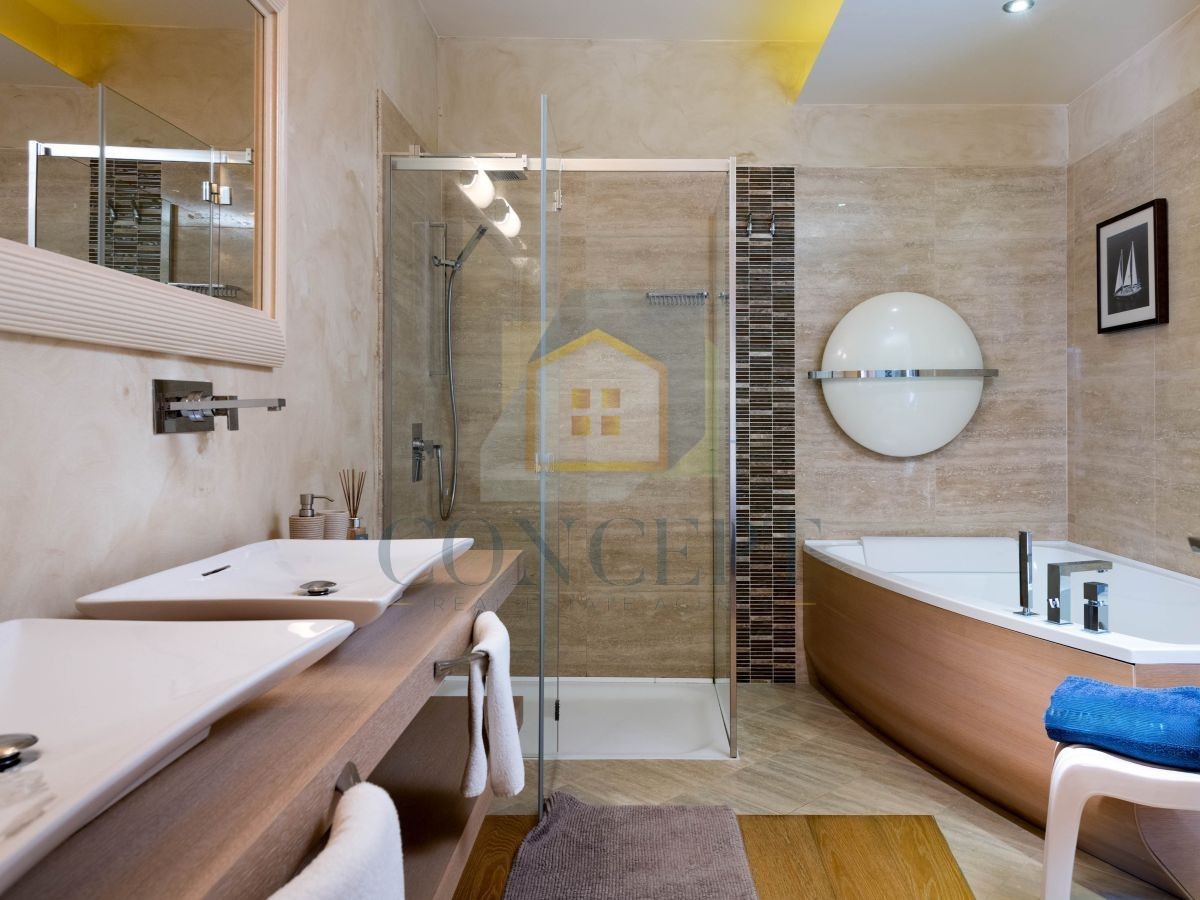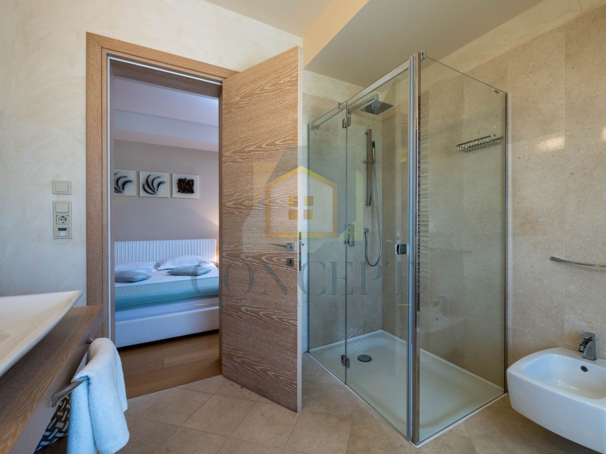 Na katu su dvije spavaće sobe, svaka s vlastitom kupaonicom – jedna s tušem, druga s kadom. Obje imaju izlaz na balkon s pogledom na vrt i bazen. Vila je opremljena podnim grijanjem, ventilokonvektorima, klima uređajem i solarnim panelima.