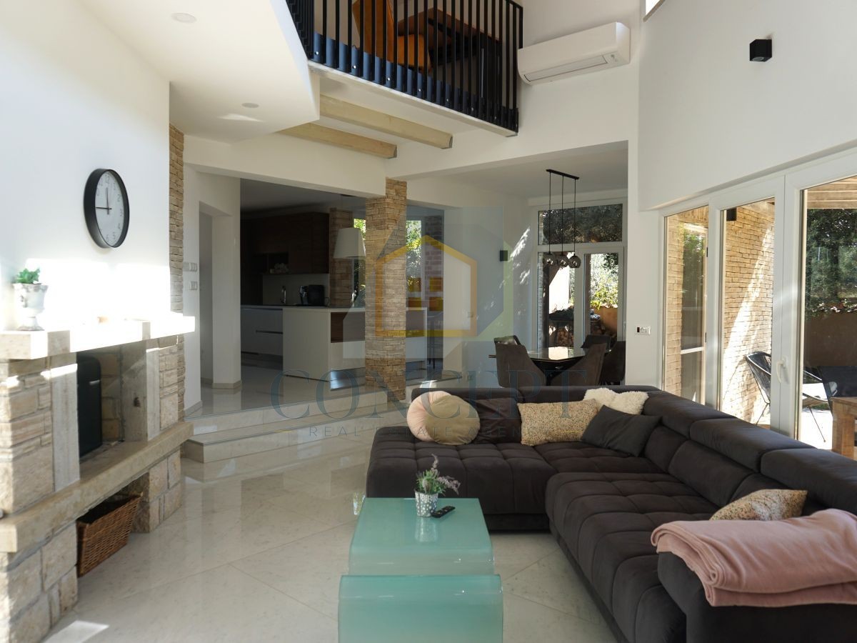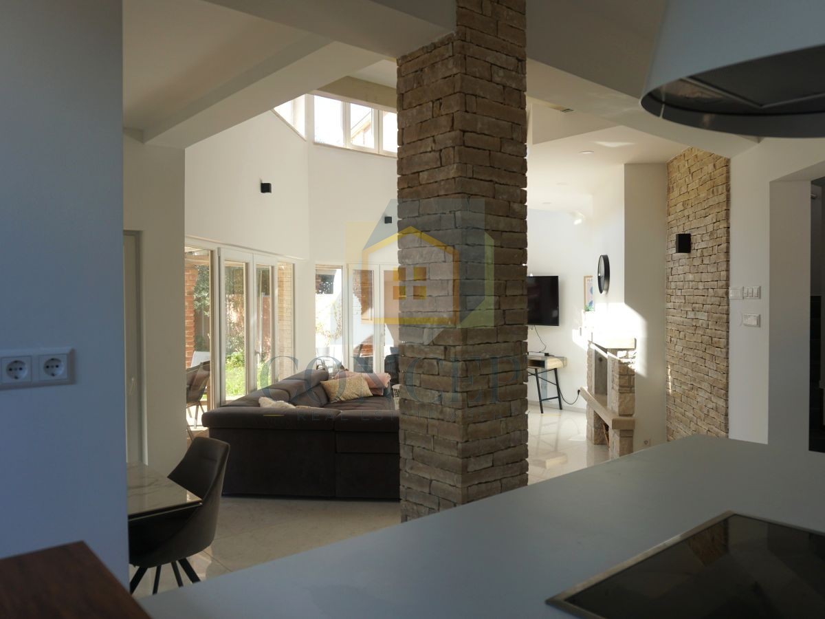 Unutarnje stubište vodi na gornji kat s galerijom koja gleda na dnevni boravak. Na katu su dvije spavaće sobe i moderna kupaonica. Jedna soba ima galeriju na dvije etaže, dok druga ima izlaz na balkon s pogledom na vrt i bazen.