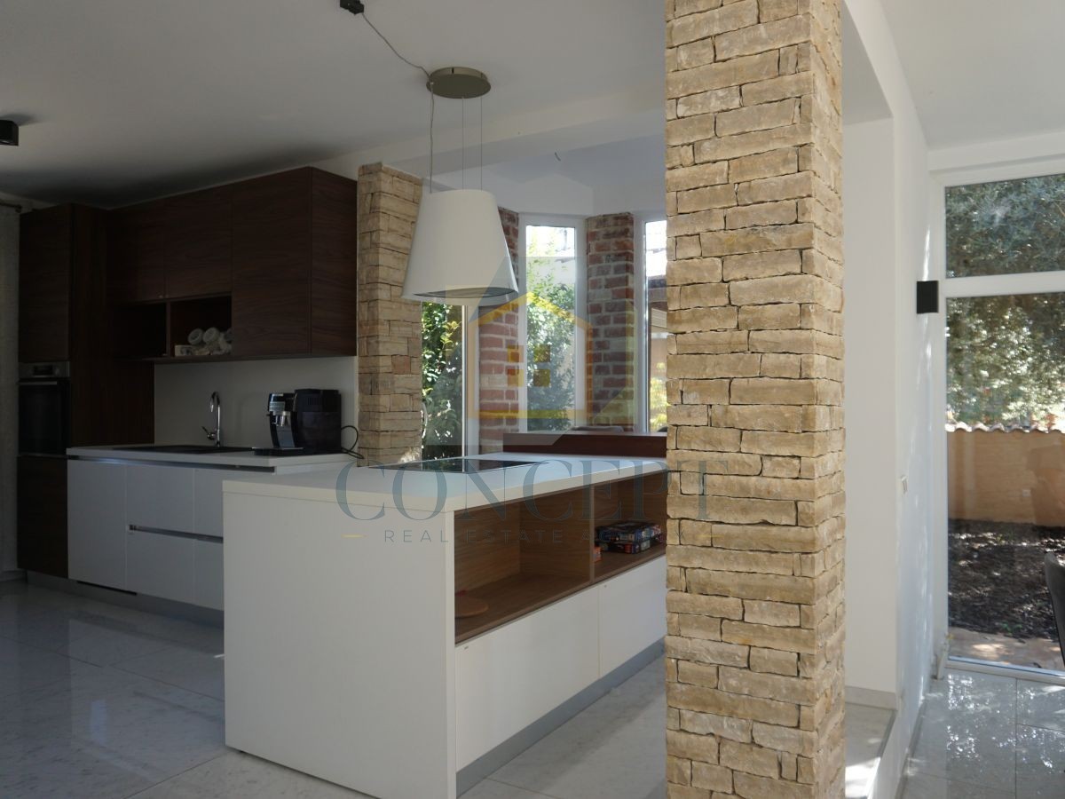 Prizemlje se sastoji od ulaznog prostora, spavaće sobe, kupaonice s tušem i toaleta te otvorenog prostora s kuhinjom, blagovaonicom i dnevnim boravkom. U dnevnom dijelu ističu se kameni zidovi i dekorativni stup od prirodnog kamena, dok drvene grede i otvoreni kamin unose istarski šarm i toplinu prostora. Iz dnevnog boravka izlazi se na natkrivenu terasu, okruženu uređenim vrtom s maslinom, roštiljem i prostorom za objedovanje na otvorenom.