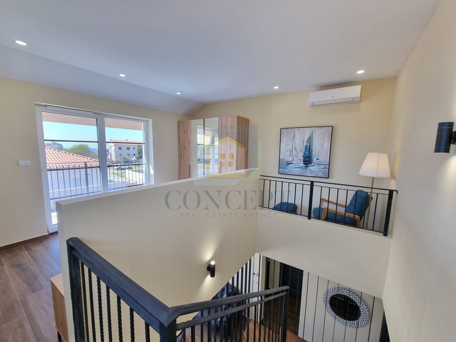 Unutarnje stubište s drvenim gazištima od hrasta vodi na kat, gdje se nalazi dodatna spavaća soba s terasom, pogledom na more i okolicu te vlastitom prostranom kupaonicom.