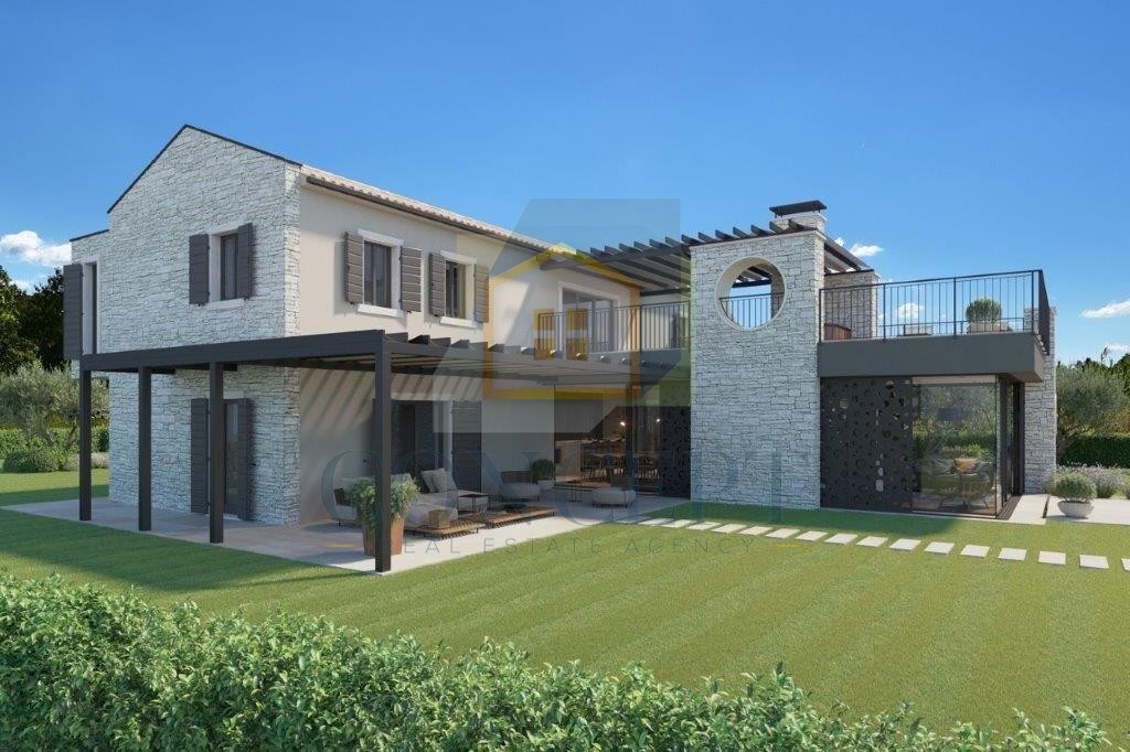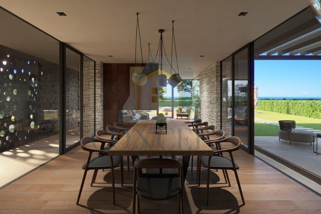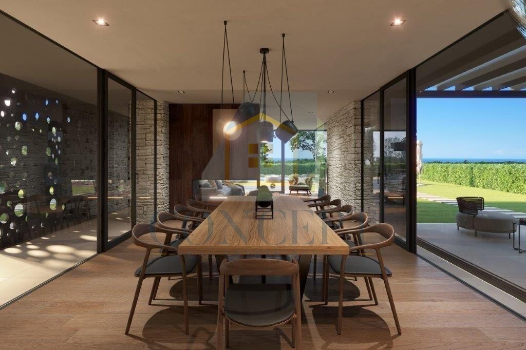 In vendita moderna villa con vista aperta sul mare, vigneti e uliveti, nei dintorni di Poreč, a 10 km dal mare e a 2 km dal centro del paese dove si trovano negozi, posta e scuola.