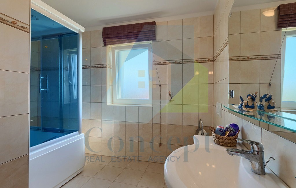 Oprócz pięknej willi, w ofercie znajduje się również duży basen o powierzchni 48 m2 z strefą masażu, zewnętrzny schowek, zewnętrzny kominek, elektryczne zamknięcie bramy, system alarmowy oraz system nawadniania trawnika.