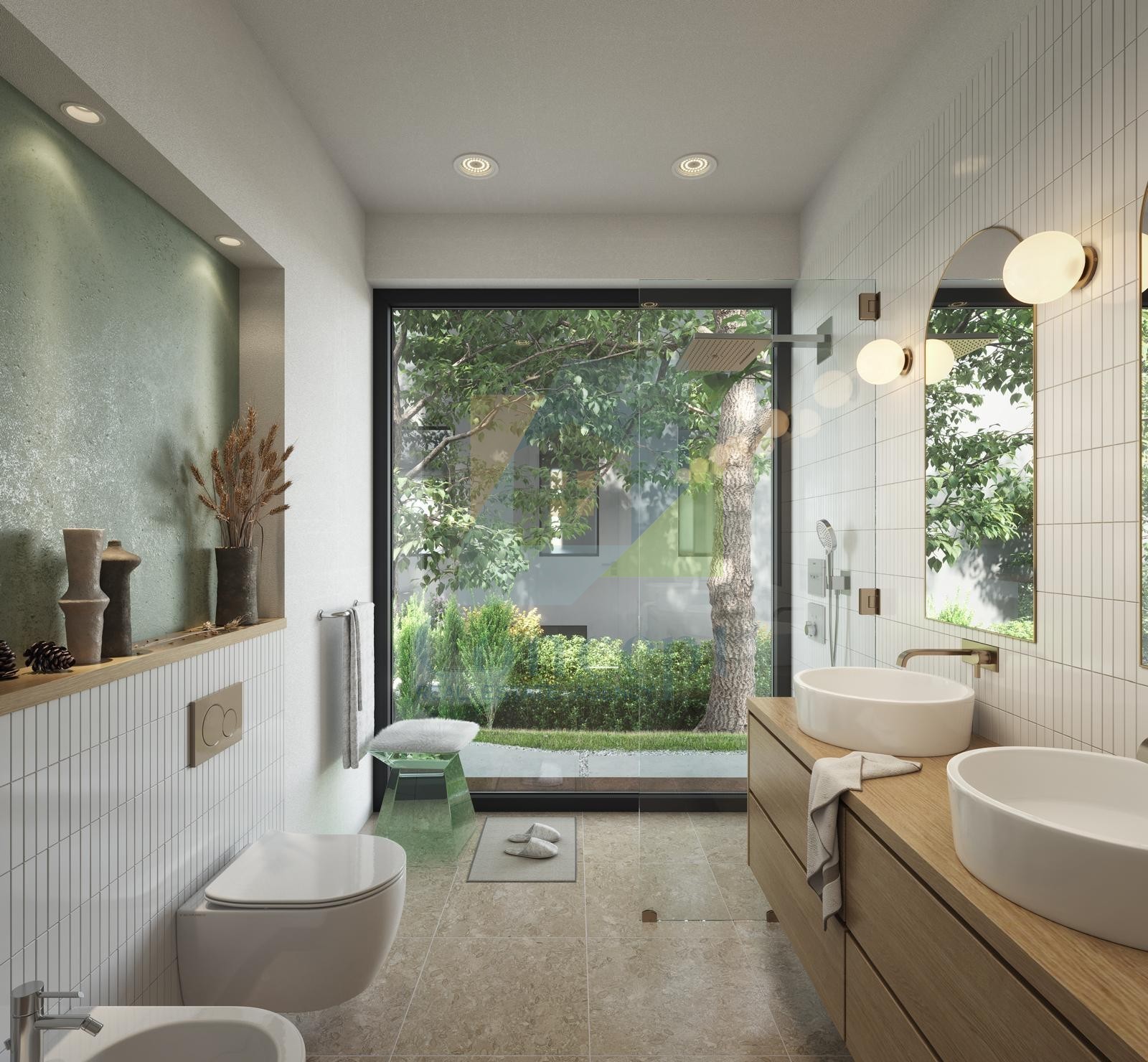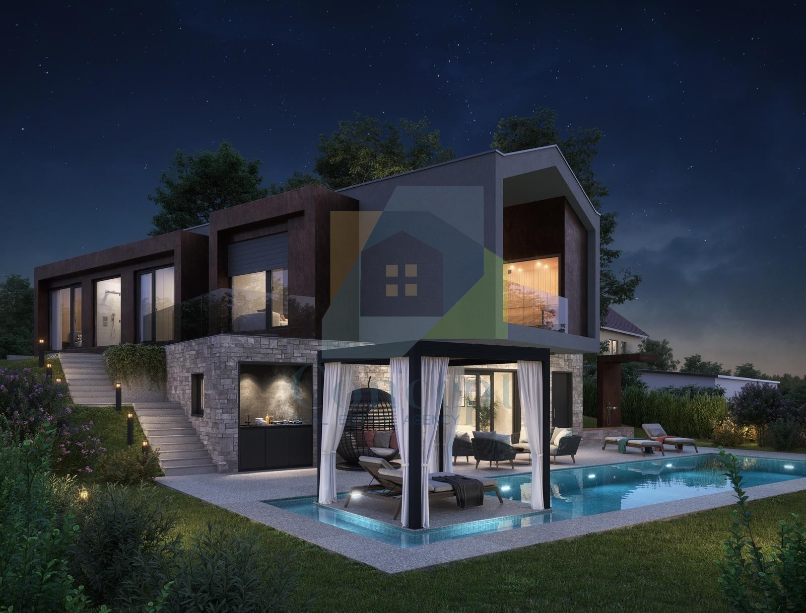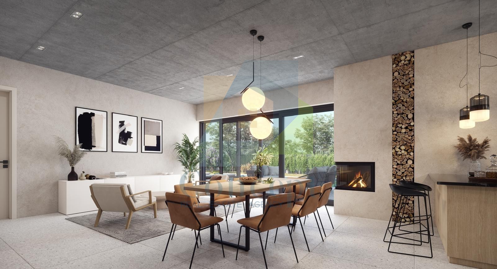 Ta moderna nepremičnina bo obsegala približno 200 m², razporejenih v dveh nadstropjih. V pritličju bo prostorna dnevna soba s kaminom na drva, povezana s kuhinjo in jedilnico v odprtem prostoru, shrambo, WC-jem za goste ter kotlovnico. Iz dnevne sobe se bo skozi velika steklena vrata izhajalo na teraso, kjer bo nameščena poletna kuhinja in ogrevan bazen velikosti 56 m², idealen za uživanje v toplih dneh.