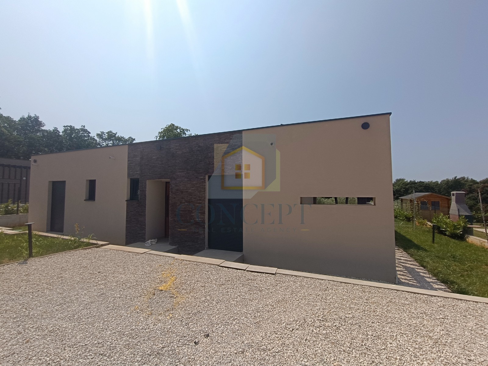 V mirnem predelu v okolici Poreča, ob robu gradbene cone, se prodaja nova pritlična hiša s bazenom in odprtim pogledom na okoliško naravo. Nepremičnina je oddaljena 4,5 km od Baderne in 17 km od morja ter centra Poreča.