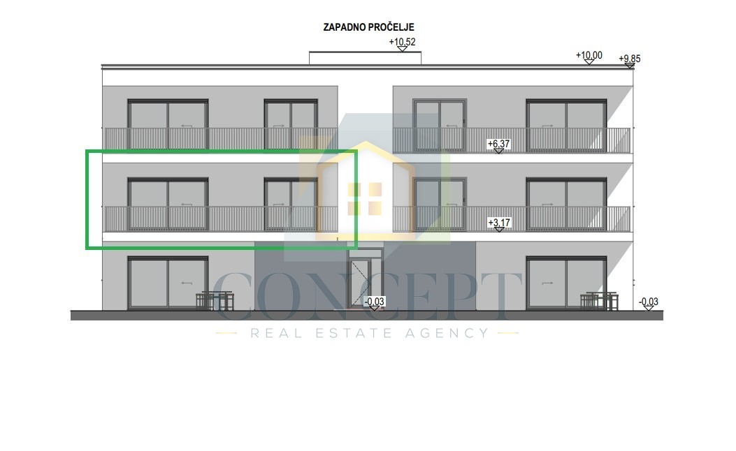 Prodaja stan na prvem nadstropju moderne zgradbe na odlični lokaciji, v naselju z vsemi potrebnimi vsebinami, oddaljenem le 7 km od Poreča in morja. Stan bo imel notranjo površino 68,5 m², z terase dodatne površine 23,4 m² pa se bo razprostiral čudovit pogled na morje.