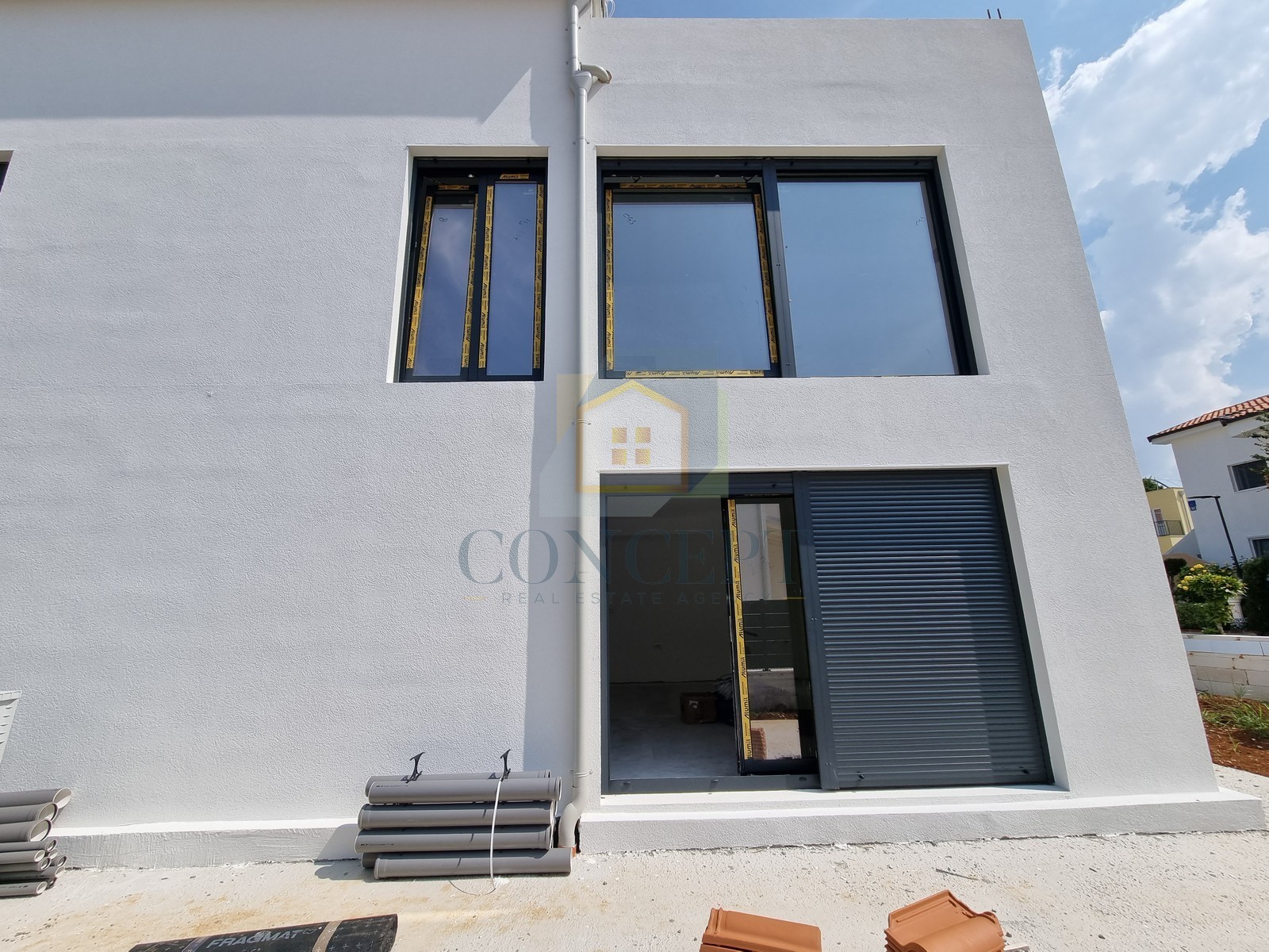 Hiša je zgrajena iz kakovostnih materialov: betonski bloki (Ytong), pralna fasada (Weber), aluminijasta stavbna dela s trojno zasteklitvijo in roletami, ekonomski nordijski radiatorji ter inverter klimatske naprave v vseh prostorih. Vgrajena je tudi kakovostna osvetlitev.